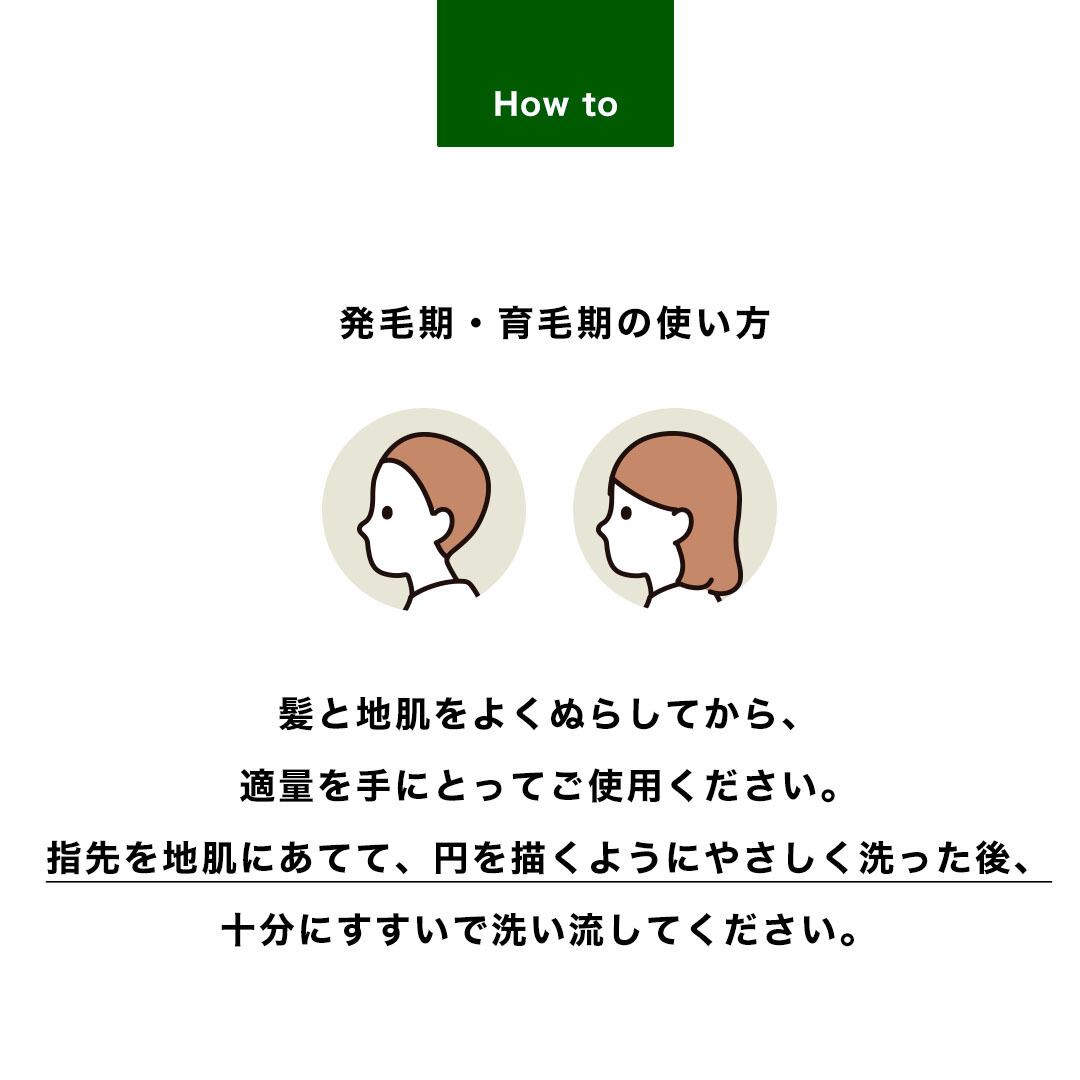 髪と地肌をよくぬらしてから、適量を手にとってご使用ください。指先を地肌にあてて、円を描くようにやさしく洗った後、十分にすすいで洗い流してください。